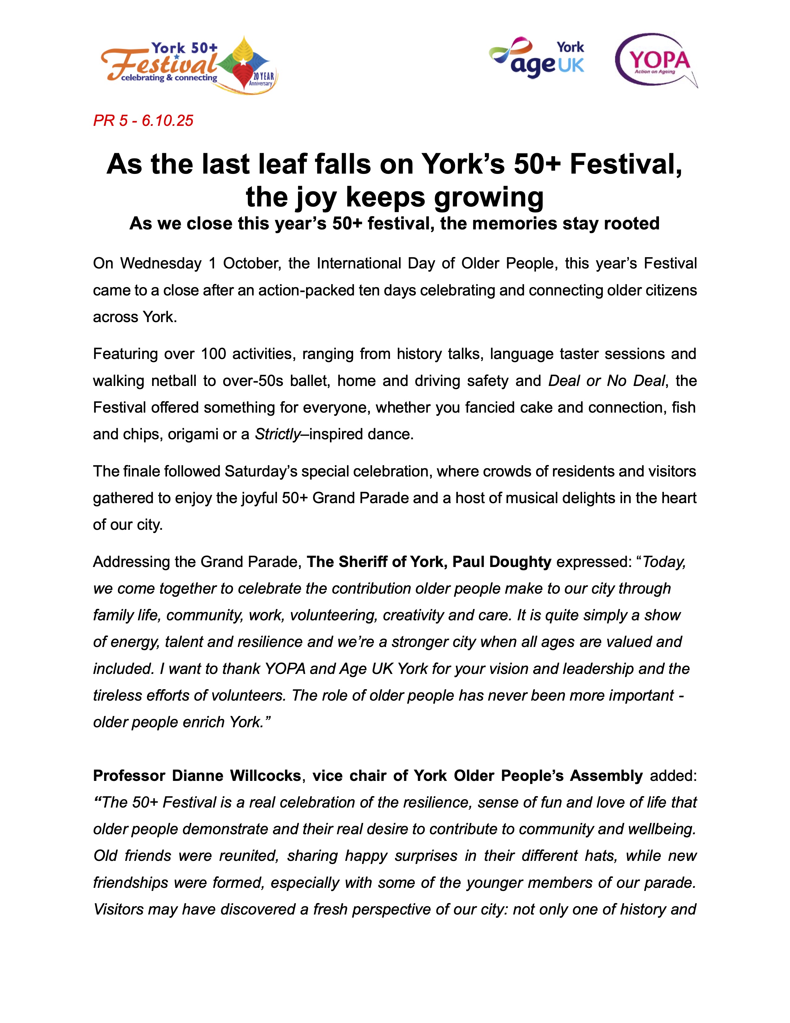 PR 5 – As the last leaf falls on York’s 50+ Festival, the joy keeps growing!